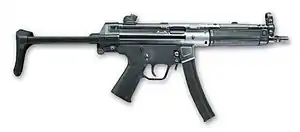 The MP5 (German: Maschinenpistole 5) is a 9x19mm Parabellum submachine gun, developed in the 1960s by a team of engineers from the German small arms manufacturer Heckler & Koch GmbH (H&K) of Oberndorf am Neckar. There are over 100 variants and clones of the MP5,[9] including some semi-automatic versions.