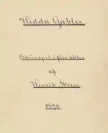 Hedda Gabler (Norwegian pronunciation: [ˈhɛ̂dːɑ ˈɡɑ̀ːblər]) is a play written by Norwegian playwright Henrik Ibsen. The world premiere was staged on 31 January 1891 at the Residenztheater in Munich. Ibsen himself was in attendance, although he remained backstage.[1] The play has been canonized as a masterpiece within the genres of literary realism, nineteenth century theatre, and world drama.[2][3][4] Ibsen mainly wrote realistic plays until his forays into modern drama. Hedda Gabler is a captivating and well-known play from the 1890s that dramatizes the experiences of the title character, Hedda, the daughter of a general, who is trapped in a marriage and a house that she does not want. Overall, the title character for Hedda Gabler is considered one of the great dramatic roles in theater.[5] The year following its publication, the play received negative feedback and reviews. Hedda Gabler has been described as a female variation of Hamlet.[6]