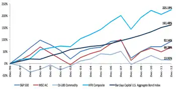 For an investor who already holds large quantities of equities and bonds, investment in hedge funds may provide diversification and reduce the overall portfolio risk.[80] Managers of hedge funds use particular trading strategies and instruments with the specific aim of reducing market risks to produce risk-adjusted returns that are consistent with investors' desired level of risk.[81] Hedge funds ideally produce returns relatively uncorrelated with market indices.[82] While "hedging" can be a way of reducing the risk of an investment, hedge funds, like all other investment types, are not immune to risk. According to a report by the Hennessee Group, hedge funds were approximately one-third less volatile than the S&P 500 between 1993 and 2010.[83]