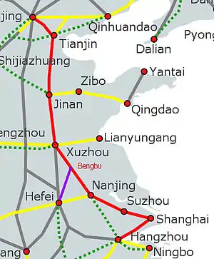 With the fastest (G-series) trains on the new line, the travel time from Hefei to Beijing South railway station is only four hours. Besides the Hefei-Beijing trains, there is also direct service from Hefei to Qingdao, via Jinan and the Jiaozhou–Jinan high-speed railway.[3][4]