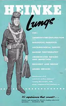 - Mid to late 1950s: the firm starts making "Heinke-Lung"[10] aqualungs, Delta[11] dry suits, Dolphin[12] and Falla[13] wetsuits, Hans Hass diving masks, swimming fins and snorkel tubes.