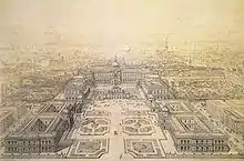 Semper designed a wide-scale 'general plan', extending from the Leopold Wing of Hofburg Palace in the northeast beyond the Ringstraße to Maria-Theresien-Platz between the mirror-imaged buildings of the Kunsthistorisches Museum and the Naturhistorisches Museum up to the nowadays Museumsquartier in the southwest. Construction started in 1871 and from 1881 the Neue Burg Wing was erected. When the masons' work ceased in 1913, the northwestern part in the Volksgarten park remained unfinished. It offers a panoramic view of the Ringstraße with the Austrian Parliament Building, the Rathaus (town hall), and the Burgtheater.