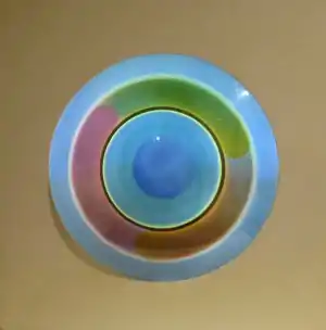 Although she painted images of the land and people of Hawaii with brush and palette knife, her fame rests upon her pioneering use of polarized light in kinetic sculpture.[3] Licomos, a kinetic sculpture from 1970, in the collection of the Honolulu Museum of Art is an example. The colors change as they move around in a circle behind stationary Plexiglass. The Bibliothèque nationale de France, the British Museum, the Honolulu Museum of Art, the Georgia Museum of Art, the Metropolitan Museum of Art, the Museum of Modern Art (New York), the Solomon R. Guggenheim Museum (New York), Stedelijk Museum Amsterdam, the Tate Gallery (London), Tokyo National Museum, the Walker Art Center (Minneapolis), and the Whitney Museum of American Art (New York) are among the public collections holding works by Helen Gilbert.[4]