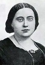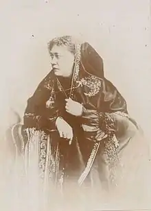 Blavatsky's family was aristocratic.[11] Her mother was Helena Andreyevna von Hahn (Russian: Елена Андреевна Ган, 1814–1842; née Fadeyeva), a self-educated 17-year-old who was the daughter of Princess Yelena Pavlovna Dolgorukaya, a similarly self-educated aristocrat.[12] Blavatsky's father was Pyotr Alexeyevich von Hahn (Russian: Пётр Алексеевич Ган, 1798–1873), a descendant of the German von Hahn aristocratic family, who served as a captain in the Russian Royal Horse Artillery, and would later rise to the rank of colonel.[13] Pyotr had not been present at his daughter's birth, having been in Poland fighting to suppress the November Uprising against Russian rule, and first saw her when she was six months old.[14] As well as her Russian and German ancestry, Blavatsky could also claim French heritage, for a great-great grandfather had been a French Huguenot nobleman who had fled to Russia to escape persecution, there serving in the court of Catherine the Great.[15]