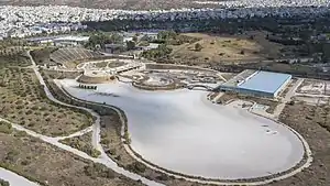 The Hellinikon Olympic Canoe/Kayak Slalom Centre is located in the Hellinicon Olympic Complex in Athens, Greece. The venue hosted the canoe slalom events for the 2004 Summer Olympics. It consists of a competition course, a secondary training course, and a warm-up lake of natural form that occupies a total area of 27,000 square metres. The total land surface area consists of 288,000 square metres. The facility seats 7,600 spectators, though only 6,700 seats were made publicly available for the Olympics. The Olympic Canoe/Kayak Slalom Centre of Athens is unique because it used salt water, rather than fresh water, to inundate the course.