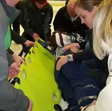 The National Collegiate Athletic Association in its advice to athletic trainers and team physicians, contained in the NCAA Sports Medicine Handbook, advises that the helmet should never be removed from an injured athlete, conscious or unconscious, with a suspected or potential head or neck injury during pre-hospital management. In this advice, certain assumptions are made. The first is that the facemask can be removed so that airway care, if needed, can be carried out. The second is that the helmet fits securely so that supporting the helmet will support the athlete's head and neck. The advice accepts that helmet removal may be necessary if an ill-fitting helmet prevents the head and neck from being secured safely for emergency transport. It is also accepted that helmet removal may be necessary if, for some reason or another, the facemask cannot be removed in a reasonable time. There is general agreement that should helmet removal be required, it should only be carried out by trained personnel. The NCAA also asserts that the injured athlete should be maneuvered to a spine board for transport as a 'single unit' using a lift/slide maneuver or log-roll technique.