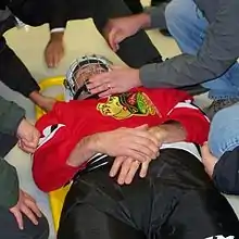 - Laprade RF, Schnetzler KA, Broxterman RJ, Wentorf F, Gilbert TJ (Nov–Dec 2000). "Cervical spine alignment in the immobilized ice hockey player. A computed tomographic analysis of the effects of helmet removal". Am J Sports Med. 28 (6): 800–3. doi:10.1177/03635465000280060601. PMID 11101101.