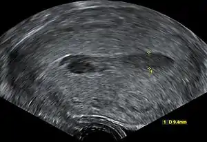 | Transvaginal ultrasonography of a hematometra after childbirth, seen as a hypoechoic (darker) area within the uterine cavity. The cervix is located to the left in the image, and the fundus is located to the right. | |