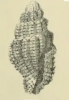 (Original description) The shell is globosely conical, somewhat peculiarly twisted or bent, <ith a distinct suture. It is white, with a pink tinge towards the top. The apex is very obtuse, with a decollated appearance. The shell contains 6 whorls. They are longitudinally ribbed, with the ribs thick and prominent, distantly transversely striated, so as to present a granulose appearance. At the base of the body whorl occur several rows of small granules. The columella is peculiarly twisted. The aperture is narrowly contracted. The outer lip is thick, in the middle bent inwards.[2]