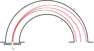 In general, these trajectories are described in polar coordinates for the plane of the great circle for electrons impinging at an angle with respect to the normal to the entrance, and for the initial radii to account for the finite aperture and slit widths (typically 0.1 to 5 mm):[4]