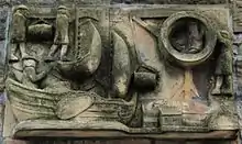 On Henderson Street, about halfway along the length of this wall, a stone tablet known as the Porters Stone is inlaid into the stone work. As stated on the plaque beneath it, this is a copy of the original Porters Stone. The original carving dates from 1678 and gives a pictorial representation of how wine was unloaded and transported through Leith at that time — showing the Porters of Leith at work.[38] The Porters Stone was originally located at Tolbooth Wynd, which lies at the Shore end of Henderson Street. All traces of the old Tolbooth Wynd have since been demolished and replaced by modern flats (though the name remains). The old Tolbooth Wynd led to Leith's Kirkgate and formed a major thoroughfare to and from the Shore until Henderson Street was built.[6] The Porters were a trade guild — one of the many important and sometimes very powerful trade guilds of Leith's past.[39]