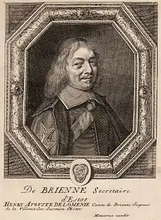 - Louis-Henri de Loménie de Brienne (born 13 January 1636, died at Château-Landon 17 April 1698), became Secrétaire d'État des Affaires Ètrangères, succeeding his father from 24 August 1651[2] to 14 April 1663, Conseiller d’État on 12 September 1651, retired at Les Pères de l’Oratoire from 24 January 1664 to 12 June 1670, committed by a lettre de cachet to an insane asylum, the Abbey of Saint-Lazare, from 27 January 1674 to 1692