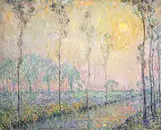 In Paris he studied under Alexandre Cabanel, one of the most influential teachers of belle époque French painting.[5] Although Cabanel generally painted in an academic style, that were dismissed derisively as L'art pompier (literally ‘Fireman art’) by some critics, [6] he possessed a deep knowledge of nineteenth century French art, in particular of En plein air painting[note 2] and the naturalism of the Barbizon School.[7] According to his biographer Le Sidaner saw Manet's final exhibits at the Paris Salon and was deeply reflective at what he saw in the modernist Manet's work. The result was that Le Sidaner resigned from Cabanel's school, on the grounds of artistic differences.[2] Le Sidaner's interests in the use of colour, softness of form and in painting in the gloaming light were formed during this period as he sort an artistic cure in naturalism and En plein air painting.[8]