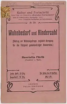 Henrietta Fürth represented that part of the proletarian women's movement that was oriented towards the SPD.[7] As early as 1896 she distanced herself from the formidable Clara Zetkin when she rejected the ideal of a separation between the "bourgeois" and "proletarian" women's movements.[8][9] Her own economic situation was conventionally middle class: for a time the Fürths employed two household servants. However, as her husband's leather wholesaling business declined and then, in 1901, went bankrupt she had to go out to work, first as a housing inspector and later as a paid secretary with the "Israelitische Hilfsverein". She was subsequently employed as a journalist and in public relations work for the National Private Welfare Centre ("Zentrale für private Fürsorge", as it was then known). Around this time she also teamed up with Bertha Pappenheim, founding the "Weibliche Fürsorge" to work on women's welfare issues, but, on account of "considerable differences" between the two women, little "fruitful collaboration" came of the partnership.[2]