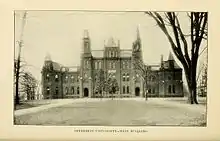 In 1872, Thompson was elected president of Otterbein University, and remained in that position until 1886.[12] He received a doctorate in divinity from Otterbein the following year.[3] As president, Thompson continued to teach and delivered speeches around the country on school or church business.[12] Thompson took office shortly before the financial Panic of 1873, with the result that his primary concern as president was keeping the college funded.[13] In this he was successful, although the college had to borrow money to stay afloat until the economy recovered.[14] After the initial debt was incurred, Thompson worked to raise donations to pay it off more quickly.[15] He also worked to attract new professors to teach at Otterbein, improving both the quality of education and the school's reputation among scholars.[16] Thompson was involved in organizing the General Board of Education of the United Brethren Church, which served as a coordinating body for the schools affiliated with the church.[17]
