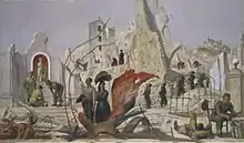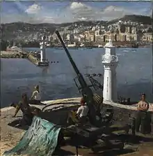 At the outbreak of World War II, Carr was offered commissions by the War Artists' Advisory Committee to paint scenes of bomb damage in London, both to landmarks such as St. Pancras Station and St. Clement Danes Church and to housing in the suburbs. An exhibition of his war paintings was held at the National Gallery in July 1940.[3] Carr's own home and studio were destroyed in the Blitz.[4] A trip on a British merchant navy ship resulted in the paintings The Merchant Navy:The Chain Locker and Merchant Seaman Fireman. In 1943 Carr became a full-time, salaried, War Office Artist and travelled first to North Africa and then to Italy. As well as portraits of Allied soldiers and officers, he painted military actions and landscapes in Algiers, Tunis, Cassino and Sessa in Italy. In 1944, he witnessed, and painted, an eruption of Mount Vesuvius. Later in 1944 he left Italy after becoming ill.[5]