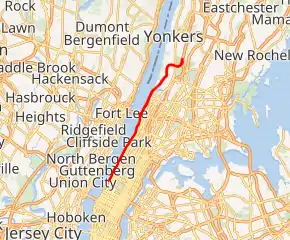 The Henry Hudson Parkway begins in Hell's Kitchen at 57th Street on the northbound side and 56th on the southbound side, which also serves as the north end of the West Side Highway and the last remaining section of the West Side Highway's predecessor, the Miller Highway.[3] The junction is numbered as exit 8, continuing the numbering scheme used on the West Side Highway. It heads northward along the west side of Manhattan, connecting to West 79th Street with a large interchange and to other surface streets with more intermittent exits along the way. The parkway continues in a northerly direction, running almost parallel to Riverside Drive north of West 158th Street. It passes under the Trans-Manhattan Expressway (I-95 and U.S. 1) and the George Washington Bridge as it continues its progression through Fort Washington Park, Fort Tryon Park, and Inwood Hill Park. It then runs northward across the Henry Hudson Bridge into the Bronx.