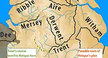 In Act III sc. 1, Hotspur, promised all of England north of the Trent, proposes diverting the river southwards to give him a still greater share. The plan highlights his destructive and argumentative nature.