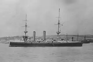 Promoted to commander on 1 January 1890,[4] Jackson became commanding officer of the torpedo school training ship HMS Defiance at Wearde Quay near Saltash in January 1895: at the school he established an early reputation as a pioneer of ship-to-ship wireless technology.[5] Promoted to captain on 30 June 1896,[6] he became the first person to achieve ship-to-ship wireless communications and demonstrated continuous communication with another vessel up to three miles away.[5] He became naval attaché in Paris in 1897 and went on to be commanding officer of the cruiser HMS Juno (equipped with wireless) in July 1899 and commanding officer of the torpedo depot ship HMS Vulcan (also equipped with wireless) in the Mediterranean Fleet in December 1899.[2] He worked with Marconi to develop a fleet wireless system and this achievement was recognised with his election as a Fellow of the Royal Society in 1901.[2] He went on to be Assistant Director of Naval Ordnance at the Admiralty in February 1902,[7] Commanding Officer of the battleship HMS Duncan in October 1903 and Captain of the torpedo school HMS Vernon in September 1904.[2]