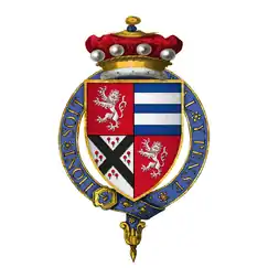 Sir Robert de Marny quartered the arms of his parents, Sir William de Marny and Catherine Venables. He married Alice le Lacer in 1345.[5] Their son was Sir William (c.1370-1414), of Layer Marney, Essex and Kingsey, Buckinghamshire, a Sheriff of Cornwall, then of Essex and Hertfordshire. He married Elizabeth Sergeaux, daughter and co-heiress of Sir Richard Sergeaux of Colquite, Cornwall (d. 30 Sep 1393).[6][7] Sir William Marney's heir, Thomas, served under Clarence when Henry V first invaded France and was knighted, but he died in 1421, perhaps at Baugé, leaving the family estates to his younger brother John. The latter's son, Sir Henry Marney KG, was created Lord Marney by Henry VIII.[6]