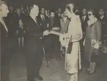 In 1948, Moore won the International Sculpture Prize at the Venice Biennale.[77] He turned down a knighthood in 1951 because he felt that the bestowal would lead to a perception of him as an establishment figure and that "such a title might tend to cut me off from fellow artists whose work has aims similar to mine".[61] He was, however, awarded the Companion of Honour in 1955,[78] the Order of Merit in 1963[79] and Erasmus Prize in 1968.[80]