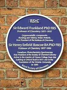 Roscoe studied at the Liverpool Institute for Boys and University College London. He then went to Heidelberg to work under Robert Bunsen, who became a lifelong friend. He also befriended William Dittmar.[2] In 1857, Roscoe returned to England with Dittmar and was appointed to the chair of chemistry at Owens College, Manchester, with Dittmar as his assistant. In 1858 the state of the college was such that the Manchester Guardian called it "a mortifying failure". In the same year Roscoe was accosted by a tramp near the college who asked him if it was the night asylum; he wrote "I replied that it was not but if he would call again in six months' time he might find lodgings there."[3] Roscoe remained at the college until 1886 by which time the Victoria University had been established.[4] In 1881 he was a founder, and first president, of the Society of Chemical Industry and was also chair of the Manchester Section of the Society.[5] From 1885 to 1895 he was MP for Manchester South. He served on several royal commissions appointed to consider educational questions, in which he was keenly interested, and from 1896 to 1902 was vice-chancellor of the University of London. He was knighted in 1884.
