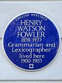 In the summer of 1899 Fowler moved to a house at 14 Paultons Square, Chelsea, London (where there is now a blue plaque in his honour), and sought work as a freelance writer and journalist, surviving on his meagre writer's earnings and a small inheritance from his father. In his first published article, "Books We Think We Have Read" (1900), he first discusses the habit among Englishmen of pretending a familiarity with certain books—such as the works of Shakespeare or books considered "juvenile"—then proceeds to recommend that the savouring of these books should be "no tossing off of ardent spirits, but the connoisseur's deliberate rolling in the mouth of some old vintage".[11] In "Outdoor London", published a year later in the short-lived Anglo-Saxon Review, Fowler describes the sights and sounds of his new home, praising its plants, its Cockney inhabitants, and its magical night scenes.[12]