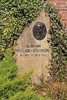 After resigning as chancellor, Müller retired from the public view. After the elections in September 1930 which saw massive gains for Adolf Hitler's NSDAP, Müller called on his party to support Brüning's government even without being part of the coalition.[3] His death in 1931 following a gallbladder operation[4] was seen as a major blow to the Social Democrats. He died in Berlin and is buried there at the Zentralfriedhof Friedrichsfelde.