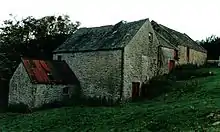 The origin of Farm Towns lies in the common medieval sub-division of land called a ploughgate (104 acres), the extent of land which one plough team of oxen could till in a year. This area was again subdivided into four husbandlands, each of 26 acres (110,000 m2). Each husbandland could provide two oxen and eight oxen were need for a plough-team. This arrangement led to small farm towns like Hessilhead being established with accommodation for at least four men in six to eight houses, taking practical considerations into account.[31] A similar 'ferm toun' existed at Bloak, near Auchentiber, until the 1890s.