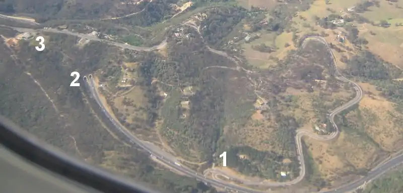 The Heysen Tunnels are twin tube road tunnels which carry the South Eastern Freeway under Eagle On The Hill in the Mount Lofty Ranges in South Australia. The tunnels were excavated using a tunnelling machine normally used in heavy-duty mining operations which tunnelled through 500 metres (1,600 ft) of rock for each tunnel at an average rate of 3 metres (9.8 ft) per day.[3] The tunnels were completed in 1998 and opened on 5 March 2000.[4][5]Each tunnel carries three lanes of traffic. As at 2015, 45,700 vehicles passed through them daily.[1] The maximum height of vehicles permitted in the tunnels is 5.3 metres (17 ft), the same as the Crafers and Mt Osmond interchanges. Laser height detectors monitor traffic to provide warnings to drivers before they attempt to enter the tunnel.[2]
