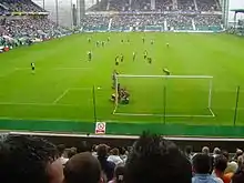 Hibernian next qualified for European competition in 2001, having finished third in the 2000–01 Scottish Premier League.[30] They entered the 2001–02 UEFA Cup and were drawn against Greek club AEK Athens.[30] The first leg in Greece, which was postponed by a week due to the September 11 attacks against the United States,[31] ended in a 2–0 defeat for Hibernian.[32] A strong performance in the return leg gave them a 2–0 lead, equalising the aggregate score.[32] Paco Luna missed a chance to score a third and tie-winning goal late in normal time, and the tie entered an extra period. Two away goals gave AEK an aggregate win, although Hibernian won 3–2 on the night.[32] Despite exiting the competition, the home game against AEK was fondly remembered by the Hibernian supporters; the actor Dougray Scott later named it as his favourite match.[33]
