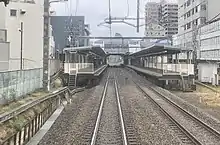The station has two ground-level side platforms serving two tracks.[2]