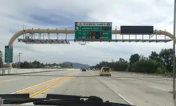 The Los Angeles Metro ExpressLanes HOT system requires vehicles to be fitted with manually "switchable" transponders where the driver selects the number of occupants, based on which the appropriate fee is charged.[13][14] California Highway Patrol officers have in-vehicle devices which display the declared occupancy of a vehicle, which they can verify visually and cite any driver(s) with fewer occupants than declared (and tolled for).[15] The new system proved itself to be highly effective in reducing the rate of lane-use violations, with it falling to 40-50% of the violation rates of other comparable California highways, from more than 20-25% (nearly one out of four or five) to just 10% (one in ten). Other transportation officials in California took note of this, subsequently leading to the Bay Area officials of Alameda County to adopt a similar system for the (then) planned Interstate 580.[16]