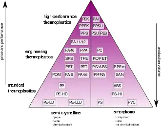 High-performance plastics are plastics that meet higher requirements than standard or engineering plastics. They are more expensive and used in smaller amounts.[1]
