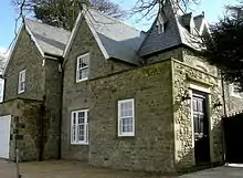 The vicarage, next to the church and on the edge of the limestone ridge,[3][8] was remodelled around 1850 and is said to contain secret passages. It has a well in the garden and a coat of arms on the exterior wall on the west side of the building.[2][13] In 1848 the vicar had the benefit of the vicarage, a glebe of 60 acres (0.24 km2) and local tithes to the value of £7 18s 1½d. The glebe may be associated with the ridge and furrow field to the north of the village.[6] The church hall was built of stone and slate in 1830 as a school, and it has a later, flat-roofed extension.[17] It was the village school until the early 1960s, then was renovated in 2000 with a grant of £57,000 from Cleartop, a waste management company. Low Coniscliffe and Merrybent share the hall with High Coniscliffe.[26]