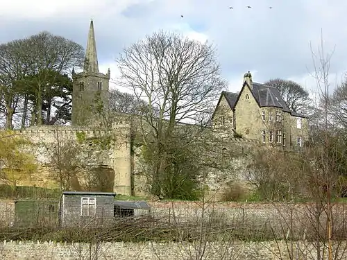 Old Hall Farm incorporates a farmhouse, at 23 The Green, whose north-west wing could be a 13th-century bastle house, built as sanctuary during raids from Scotland. Most of the building dates from the 17th century.[19] Mill house is considered old but has been restored with a heron weather vane. The Spotted Dog pub is named after a foxhound called Blue Cap which won a race at Newmarket for a wager with a stake of 500 guineas in 1792.[2][22] The village's Methodist chapel was built in 1827 where Ulnaby Lane meets the A67, and demolished in the 1940s.[13] There is an old dovecote in the village. The Duke of Wellington pub had a picture of Napoleon on its sign from 1975 to 1988.[2] The pub's car park is the site of the old post office which doubled as the hackney carriage station, and where an Elizabethan stone sundial was found in the garden. It was near the old golf club and opposite the Methodist chapel at the southern end of Ulnaby Lane.[13] A recent development of twelve houses called Lawson's Court was built in the village in 2009. following the closure of Lawson's Garage.The Duke of Wellington closed in 2010 to become a domestic home with 2 new Houses built in the car-park.[23]