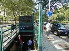 The station was located below the sites of the Sands Street terminal for BMT elevated trains, some of which traveled over the Brooklyn Bridge.[10] The BMT station closed in 1944 and was replaced by Cadman Plaza.[11] Old Fulton Street (now Cadman Plaza West) and Cranberry Street was also the site of the printing shop where Walt Whitman's Leaves of Grass was first published in 1855.[12] The area is now the site of the Whitman Close Apartments.[13]