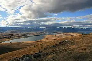 High country is a New Zealand term for the elevated pastoral land of the South Island and - to a lesser extent - North Island.[1] This terrain, which can be compared loosely with the outback of Australia, high veldt of South Africa and pampas of Argentina, lies in the rain shadow of the country's mountain ranges and tends to be extensively farmed land with a continental climate consisting of low rainfall, cold winters and hot summers. Livestock farmed in these regions include sheep and - increasingly - deer and alpaca, and a major ground-covering plant of the area is tussock.