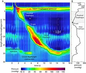 ![]() This figure shows a pressure topography plot during a normal swallow, measured using a 36-channel high-resolution manometry system. Time is on the horizontal axis and length along the esophagus on the vertical axis. Pressure magnitude is encoded in color corresponding to the scale shown at the bottom. High-pressure regions are denoted by the red end of the spectrum while the low pressure regions by the blue end. Data collected at The University Hospital, Cincinnati and plotted using MATLAB (The MathWorks Inc., Natick, MA) by Sudip K. Ghosh, PhD (University of Cincinnati) | |