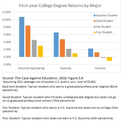 The view that higher education is a bubble is highly controversial. Most economists do not think that returns to a college education are falling but instead believe that the benefits far outweigh the costs.[8][9][10][26] Yet, the returns for marginal students or students in certain majors, especially at costly private universities, may not justify the investment.[27] It has been suggested that the returns to education should be compared to the returns to other forms of investment such as the stock market, bonds, real estate, and private equity. A higher return would suggest underinvestment in higher education, but lower returns would suggest a bubble.[28] Studies have typically found a causal relationship between growth and education, although the quality and type of education matters, and not just the number of years of schooling.[29][30][31][32]