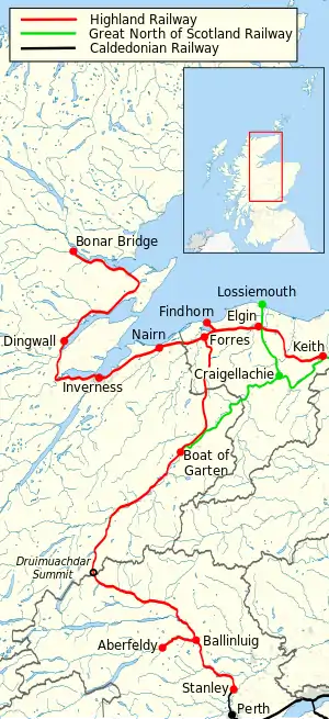 The Highland Railway (HR) was one of the smaller British railways before the Railways Act 1921, operating north of Perth railway station in Scotland and serving the farthest north of Britain. Based in Inverness, the company was formed by merger in 1865, absorbing over 249 miles (401 km) of line. It continued to expand, reaching Wick and Thurso in the north and Kyle of Lochalsh in the west, eventually serving the counties of Caithness, Sutherland, Ross & Cromarty, Inverness, Perth, Nairn, Moray and Banff. Southward it connected with the Caledonian Railway at Stanley Junction, north of Perth, and eastward with the Great North of Scotland Railway at Boat of Garten, Elgin, Keith and Portessie.[1]
