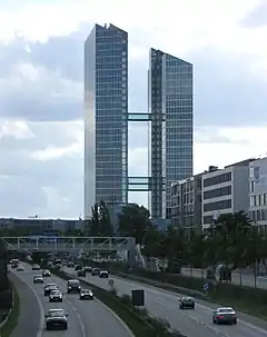 Highlight Towers is a twin tower office skyscraper complex completed in 2004 in Munich, Germany, planned by architects Murphy/Jahn of Chicago. Tower I is 126 m (413 ft) tall with 33 storeys, and Tower II is 113 m (371 ft) tall with 28 storeys, which make them among the highest buildings in the city. The towers are joined by two skyways made of glass and steel. Also in the complex are two low-rise buildings between the twin towers, that serve as a hotel and additional office space. Overall, the facility offers approximately 73,836 m2 (794,760 sq ft) of office space.