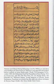 Hikayat Merong Mahawangsa (Jawi: حكاية مروڠ مهاوڠسا ), alternatively spelt Hikayat Marong Mahawangsa and also known as the Kedah Annals, is a Malay literary work that gives a romantic account of the history and tales of Kedah.[1] The work is thought to have been written in the late 18th century or some time in the 19th century.[2][3] Although it contains historical facts, there are also many incredible assertions in its accounts. The era covered by the text ranged from the opening of Kedah by Merong Mahawangsa, allegedly a descendant of Alexander the Great of Macedonia till the acceptance of Islam.
