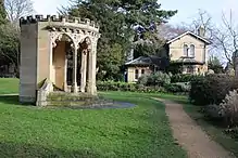 There is a disused chapel located on the east side of the park, It is a Grade II listed building.[8] It is the chancel of the Leper's hospital chapel founded around the 12th century, the rest of the hospital stood on the opposite side of London Road. There are many carvings on the walls of the chapel which may have been made by pilgrims which may represent various saints days or religious festivals. The symbols include a fleur-de-lys, a star of epiphany, symbols representing the Feast of the Cross, the feast of St Valentine and All Saints' Day. The nave of the chapel was demolished in 1861. At this time the south and west doorways were taken down and reassembled in the chancel. The south doorway has flowers and rosettes carved into it, with cable and pellet symbols. There is a life-sized 13th-century effigy of Kyneburga, a Saxon princess.[9]
