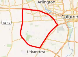 The Hilltop is bounded by Interstate 70 in the north, the CSX railroad on the east, and Interstate 270 on the south and west.[9] The Hilltop includes part or all of ZIP Codes 43204, 43222, 43223, 43123 and 43228. Its main thoroughfares are West Broad Street (U.S. Route 40) -- upon which two welcome signs for the neighborhood sit (one near I-70 and one near Wilson Road) -- Mound Street, and Hague Avenue.[10] Within these bounds there are several jurisdictions including the city of Columbus, the city of Urbancrest, the village of Valleyview, Franklin County, Franklin Township, Jackson Township and Prairie Township. This area covers approximately 9,917 acres. Just east of this area is a neighborhood by the name of Franklinton.[11] The name, "The Greater Hilltop", indicates an opportunity for the community to help shape and direct the pattern of growth and the character of future development in the neighborhood.[12]