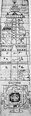 Above the vastu-purusha-mandala is a high superstructure called the shikhara in north India, and vimana in south India, that stretches towards the sky.[31] Sometimes, in makeshift temples, the superstructure may be replaced with symbolic bamboo with few leaves at the top. The vertical dimension's cupola or dome is designed as a pyramid, conical or other mountain-like shape, once again using principle of concentric circles and squares (see below).[2] Scholars such as Lewandowski state that this shape is inspired by cosmic mountain of Mount Meru or Himalayan Kailasa, the abode of gods according to its ancient mythology.[26]:69–72