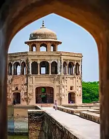 An octagonal pavilion built during the reign of Shah Jahan is at the centre of the pool.[1] The pavilion is two-storeyed, and is topped by a rooftop chhatri that served as a stone gazebo. The pavilion's architecture is similar to the Sher Mandal at Delhi's Purana Qila,[9] built by Emperor Humayun.