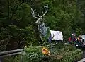 When, in 2010, the Höllental was closed to traffic for four weeks, the forestry commission used the opportunity to lift the stag off the hill on 6 August using a crane lorry. The foresters responsible for Falkenstein took 130[7] hours to remove the five layers of colour and repair the stag which had numerous bullet holes - around 35 entry holes and about 70 exit holes - and a sawn-off leg. The entry holes were already oxidised, hence it is suspected that it was made between the end of the war and the early post-war period. The reason for the number of exit holes being double the number of entry holes is because the bullets were split by iron rods in the interior before exiting through the external bronze skin. In addition a wasp’s nest was found inside the sculpture.[7] The monument was painted green and a time capsule was placed inside that commemorated the restoration. On 10 October the stag was placed on a trailer and transported from Himmelreich (part of Buchenbach) to the Red Deer Days in Häusern as part of a Red Stag Tour (Tour de Rothirsch) with stops in Feldberg, Schluchsee and St. Blasien. [8] After the stag had been placed on display there from 15 to 18 October, it was replaced in the gorge on 23 October 2010. The neckerchief that was placed on the stag’s antlers at the re-erection ceremony had been tied on by Landrätin Dorothea Störr-Ritter at the tour auftakt in Himmelreich.[7] In addition to her Waldshut colleague, Tilman Bollacher, several mayors from the participating municipalities were present.[9]