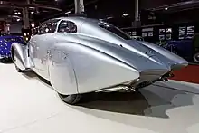 Dubonnet's focus on aerodynamics can also be seen in the exterior design of the car. The flared front fenders taper off in a teardrop shape towards the rear, as does the tail of the car. Notably, the Dubonnet Xenia has fender skirts that cover almost the entirety of the rear wheels to reduce drag, a technique pioneered 10 years earlier on a land speed record attempt car.[13]