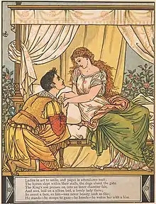 Although some of Perrault's tales had folkloric origins, he modified them with elaborate detail written in intentionally brilliant language for an audience of sophisticated adults who expected embellishment. Some stories such as "Sleeping Beauty" were original literary tales, divested from their (possible) folkloric roots. The intention was to present the précieux with modern retellings of stories from which the base, the common, and the rustic had been removed.[6] Carpenter says of "Sleeping Beauty" that "it reads like a fashionable romance rather than a folk-tale."[7] "Little Red Riding Hood" was almost certainly original, because earlier versions have not been recorded or do not seem to exist, and nothing remotely similar can be found in older literature.[10] The first edition of the volume has margin notes for "Little Red Riding Hood" telling the reader the last lines are to be read in a loud voice to scare the child, leading Carpenter to believe it was written as a children's game, though he goes on the say that the sexual connotations are impossible to ignore.[12]